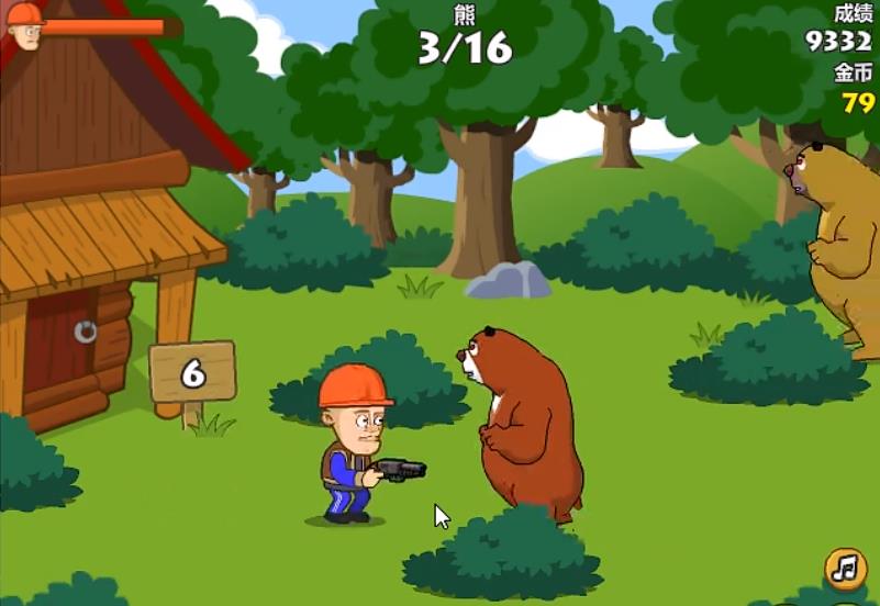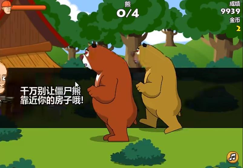 3、利用手里的武器来阻挡大狗熊的进攻,不要让它们靠近你的小木屋。