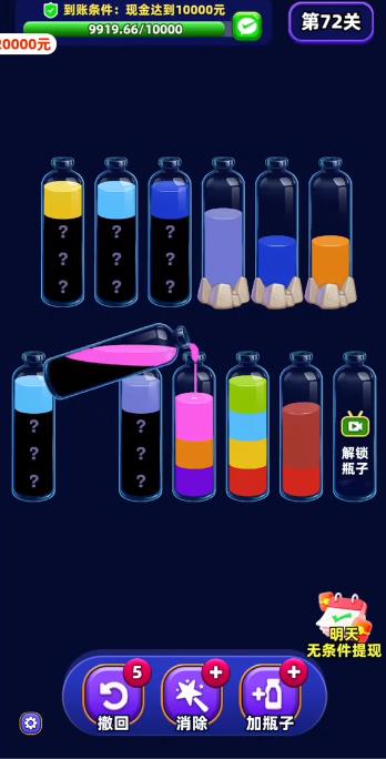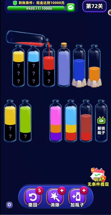 4、当所有瓶子中的液体相同后就能完成挑战,领取红包奖励。