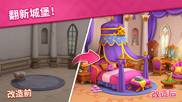 1、经典三消与古堡装扮双核心融合,消除闯关获取资源,装修改造打造专属城堡玩法双向互补。