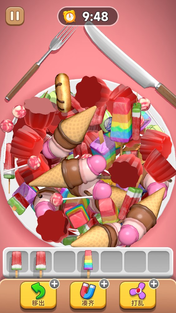2、遇到瓶颈时,合理使用移出、打乱道具,优先清理栏内冗余物品,为关键物品腾出空间。