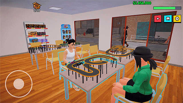 1、玩家能在店内设置赛车平台,让顾客驾驶跑车模型比赛,还能从比赛中赚取收益。