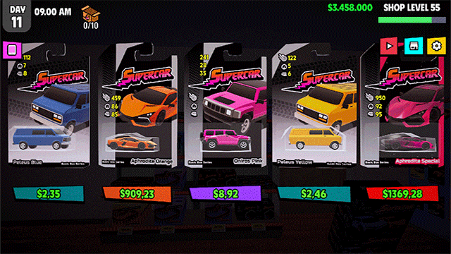 3、玩家可按照自己的喜好设计定制店铺,解锁新车、订购神秘车箱,最大化提升销售额。