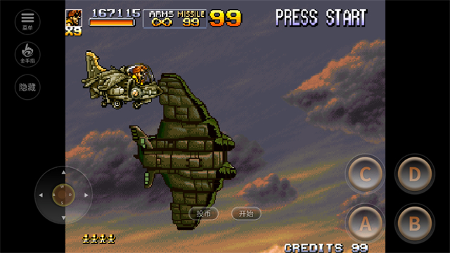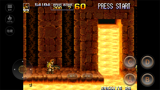 1、进入游戏启动界面后,优先确认“投币”与“开始”按钮的触控位置,根据自身游玩需求投币,新手建议先投1-2枚熟悉流程。同时可提前规划按键操作习惯,记住左侧虚拟摇杆负责移动,右侧A、B、C、D键对应射击、跳跃等核心功能,为后续流畅闯关做好准备。