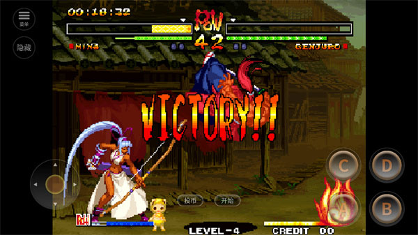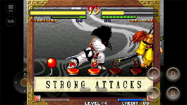 3、1v1即时对战,轻/中/重斩+踢击组合,搓招释放必杀与武器击飞技。