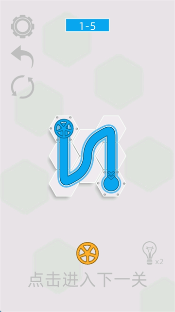 1、观察六边形网格内的水管布局,通过交换水管位置,衔接成连续通路。