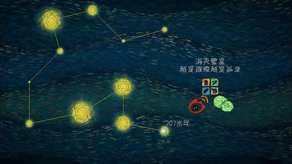 我们相距十万光年是一款充满唯美诗意的星空主题治愈手游,汲取梵高画作的艺术灵感,用手绘风勾勒出如梦似幻的宇宙画卷,搭配宁静空灵的钢琴背景音乐,为玩家营造出既神秘又孤独的宇宙氛围。在我们相距十万光年中,你将化身一颗星球,通过简单的点触操作,在璀璨星空中穿梭航行,目标是抵达那位于遥远十万光年之外的独一无二的星球。我们相距十万光年的初期关卡设计亲和,让你能快速掌握节奏,随后便可沉浸在令人心旷神怡的画风中,体验仰望星空时的凄美与苍凉,以及星云带来的壮丽与温暖。