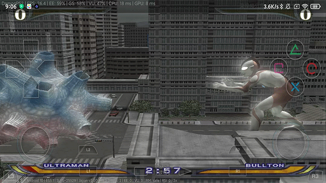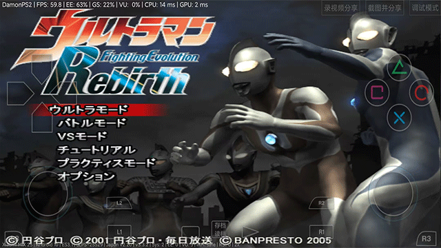 1、在本站下载并打开奥特曼格斗进化重生游戏,进入游戏主菜单,因为是日文的,提供一个中文的菜单对照图,玩家们通过左侧的方向键选择想要的模式,再点击右侧的【〇超重击】即可确认(默认【X投技】为取消、【O超重击】为确认),游戏过程中随时可以点击上方的【存档】和【读档】进行存档和读档的操作。
