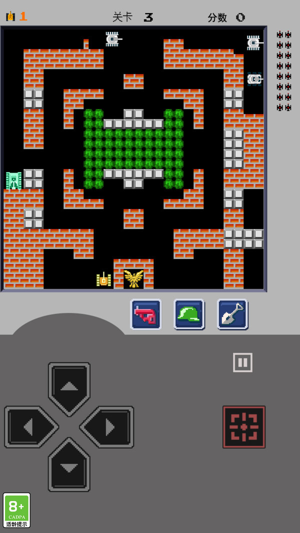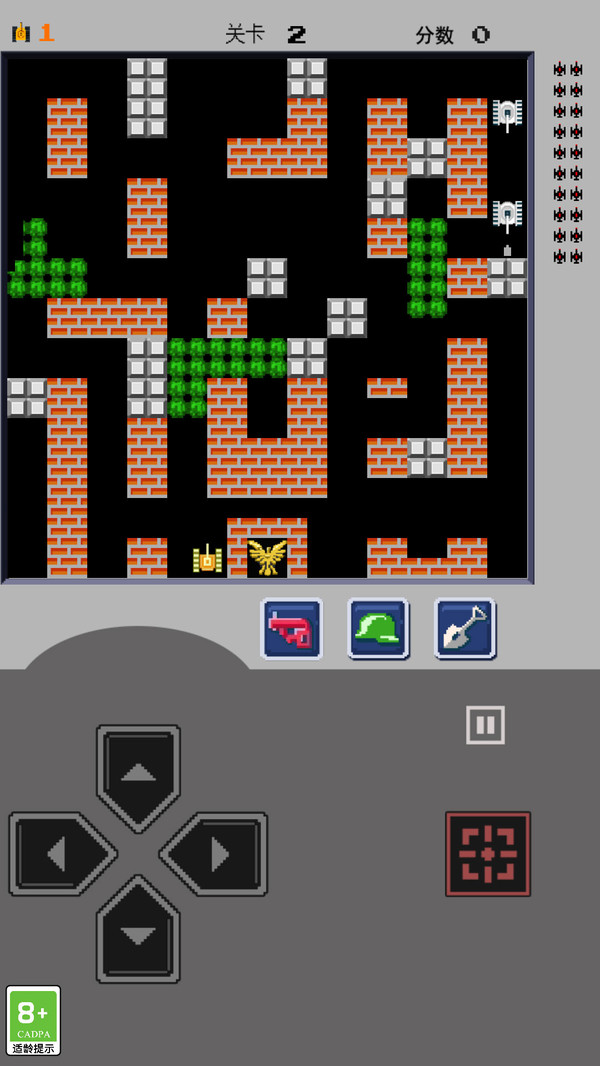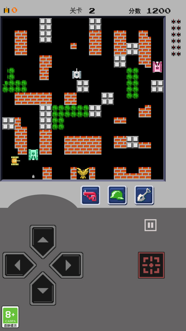 1、驾驶坦克在像素战场中移动射击,击毁每关20辆敌军坦克,守护基地老鹰图标。