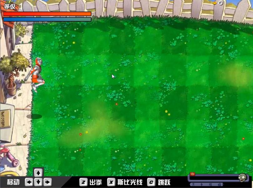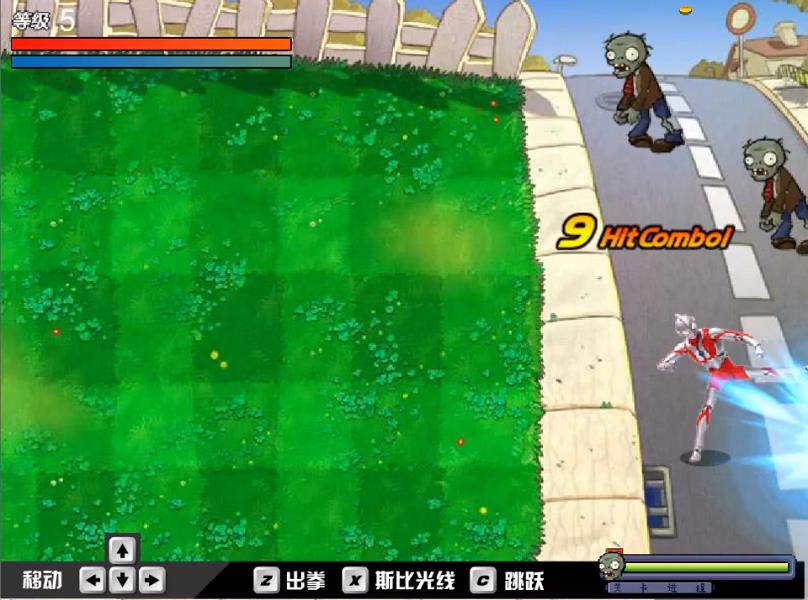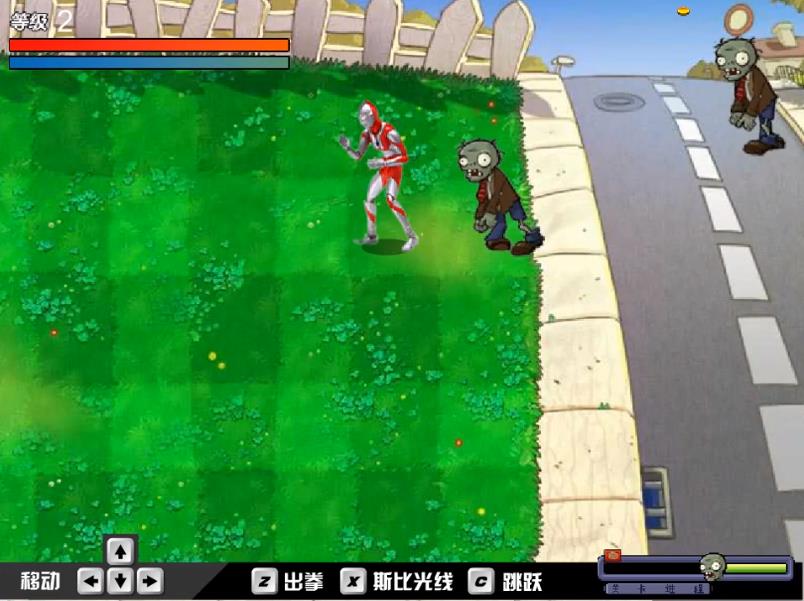 1、动作防御,操控奥特曼移动跳跃,然后可以用近战与光线技能清理入侵僵尸。