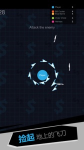 1、资源收集,在战场中拾取散落飞刀,扩充自身飞刀阵营,提升攻防能力。