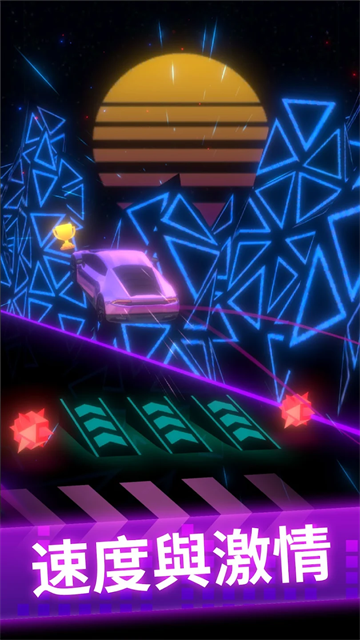 1、核心玩法为节奏竞速,跟随音乐节拍滑动操控赛车,精准收集赛道音块。