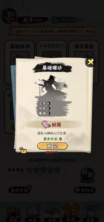 商店可用灵石兑换功法残页、道具,还能刷新货架获取更多资源。
