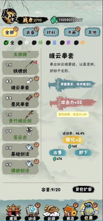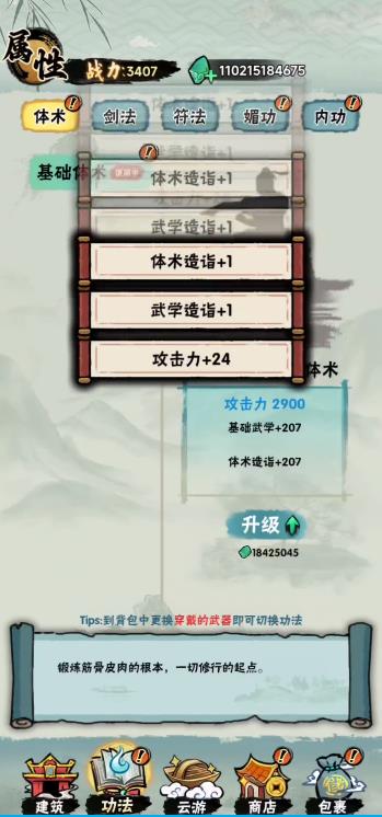 升级体术/剑法等技能,消耗灵石提升攻击、基础武学等属性,增强战力。