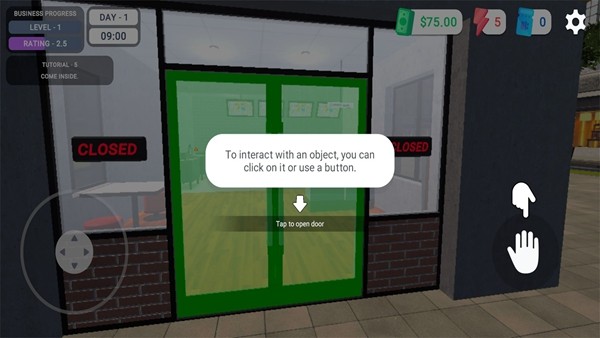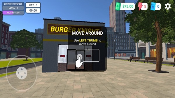 1、打开游戏,通过虚拟摇杆控制角色进入汉堡店开门营业;