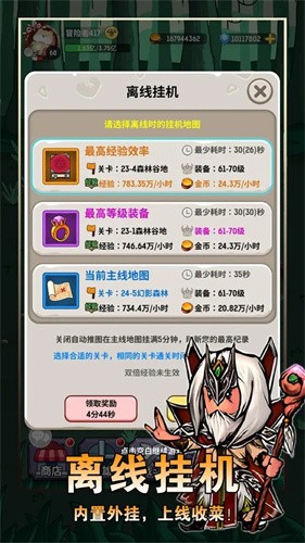2、主打佛系挂机玩法,支持离线挂机升级,解放双手,轻松获取成长的收益。