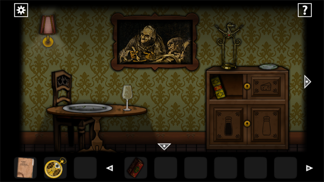 6、出来到右边的门(餐厅),拿走柜里的书,用钥匙打开下面的柜子拿走甜味剂和密封的酒,把酒放进柜顶的开瓶器,根据二图右边骷髅画上的眉毛位置以中中,上下,中上,下下,上上的顺序开瓶,摆好一次按一次红色按钮,拿走打开的酒,把安眠药水和酒倒进桌上的高脚杯里,获得一杯酒。
