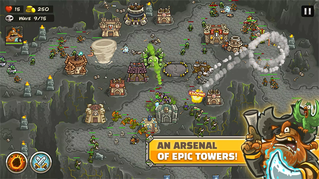 防御塔还是和以前皇家守卫军一样最经典的四个,分别对应不同的怪物,还是建议大家弓箭多一些,之后士兵,魔法和炮塔分别有一些就够了。
