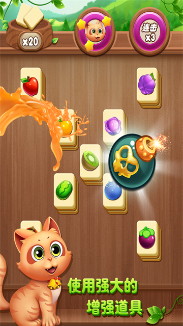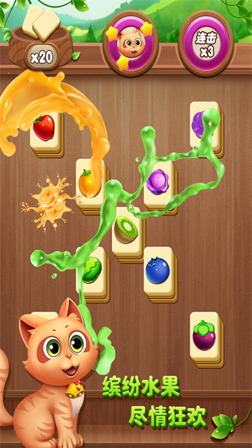 1、软萌治愈的卡通画风,清新明快的色彩搭配,果汁四溅的特效,营造轻松愉悦的游戏氛围。