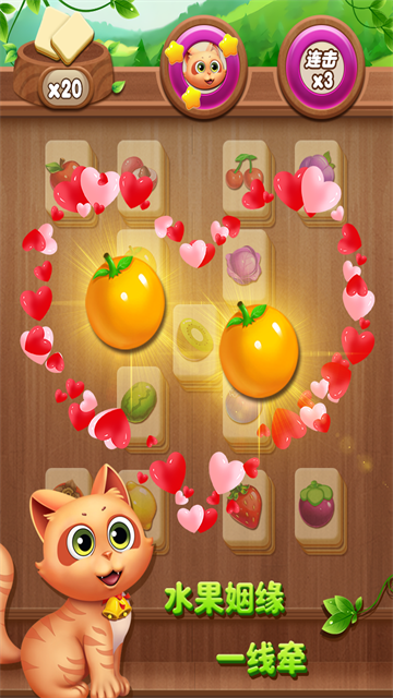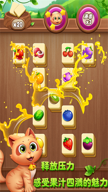 1、经典连连看核心玩法,以缤纷水果为消除元素,连接相同图案完成消除,收获通关奖励。