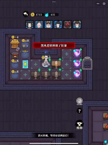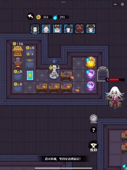 3、开局先进入空房间打坐,快速获取初始金币与资源。优先收集场上的金币道具,利用“双倍铜币”技能加速资源积累,同时根据资源情况,规划防御设施的建造位置,优先在靠近入口的点位布置基础防御塔。