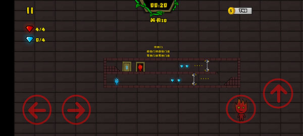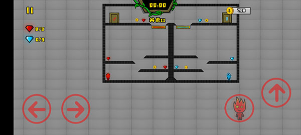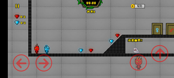 2、角色操控,分别控制冰火人移动跳跃,然后规避异色液体与危险陷阱。