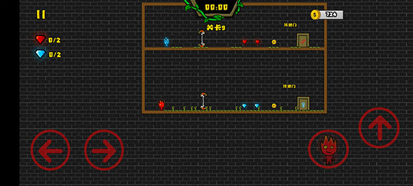 3、在游戏中玩家需要操控冰和火过关,利用左右按键操控角色的移动,右边为切换角色和跳跃按键。