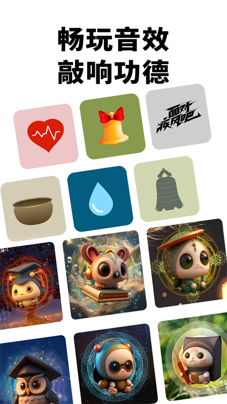 1、选择心仪的木鱼皮肤与搭配音效,开启敲击模式,在重复的轻触中释放压力,平复情绪。