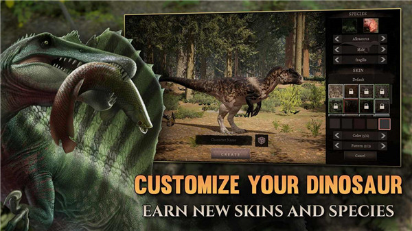 1、高自由度恐龙定制系统,数百种皮肤与颜色选项,搭配不同亚种,打造独特的恐龙形象。