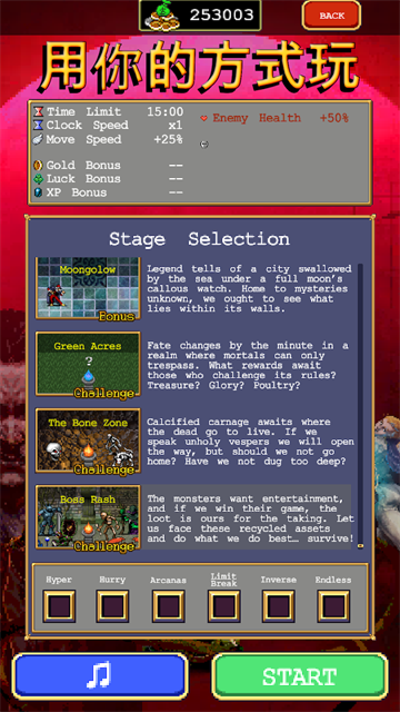 Vampire Survivors是一款割草动作射击游戏,以哥特式暗黑世界为舞台,你将化身冒险者,在被诅咒的夜晚中对抗潮水般的怪物。开局时你只有基础武器,需在地图中穿梭,收集经验与道具升级战力,解锁更强的武器与被动技能。随着时间推移,怪物密度与强度会持续攀升,你需要在有限的槽位中搭配出最优战斗组合,在无数次生死轮回中积累金币,解锁新角色与初始道具,最终成长为能撑到黎明的生存大师。游戏融合了roguelite元素,每一局都是全新的挑战。