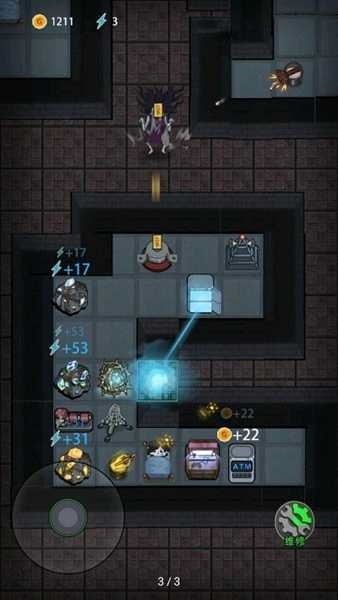2、通过击杀猛鬼获取金币、能量币,合理的分配资源升级炮塔或购买临时增益道具。