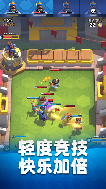 2、参与实时对战,在三分钟内部署卡牌摧毁对方国王塔,获取奖杯与宝箱奖励。