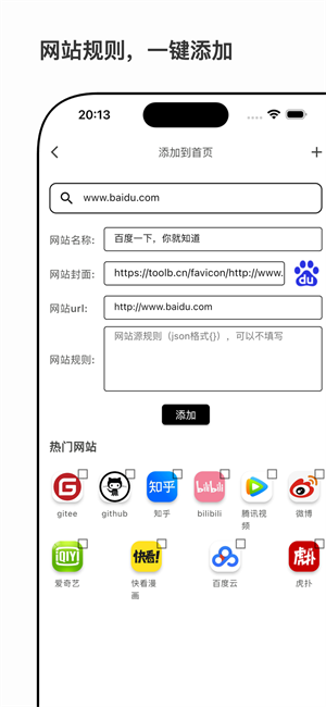 1、极简主页可自定义,常用网站和规则一键添加到首页,找起来更方便。