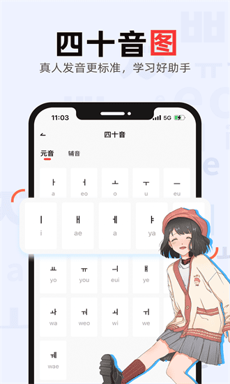 3、四十音图配真人标准发音,跟着读就可以去纠正发音,零基础也是可以练出地道韩语口音。
