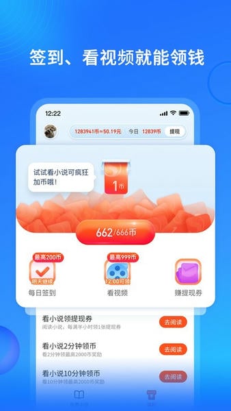 3、阅读赚钱福利更多样,签到、看视频、读小说可以去领金币,轻松兑换现金。