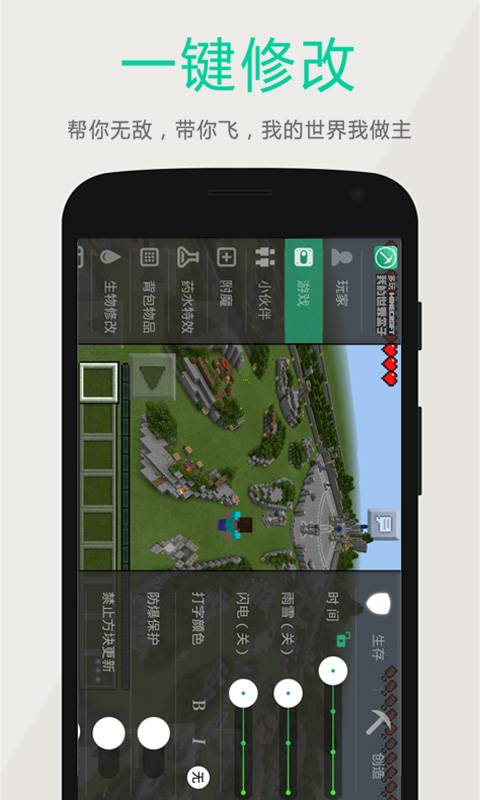 1、一键修改游戏属性,包括生物、背包物品、药水特效等,轻松拥有无敌体验。