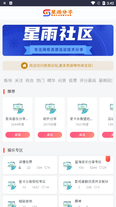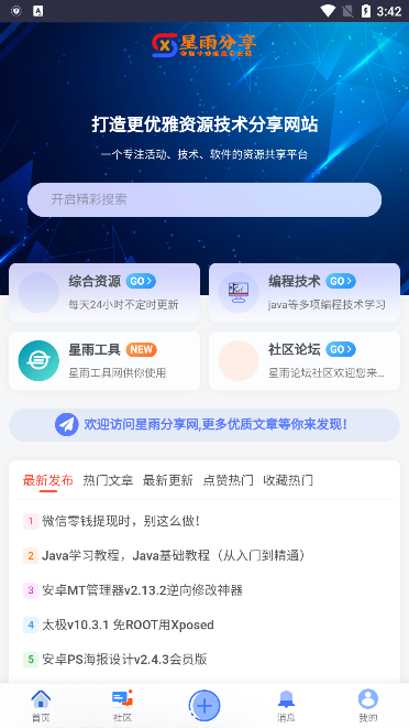 星雨社区是一款专为安卓用户打造的免费资源分享平台,主打技术资源与各类应用分享,不仅网罗了软件开发全领域的干货内容,还有日常实用应用分享,结合AI智能推荐,让找资源变得轻松,而且手机、电脑都能无缝用,新手也能快速上手,不管是学习技术、解决工作难题,还是找生活类应用,都是超实用的一站式平台,平台的任意资源获取都是十分的便捷,不同的资源选择一键去操作,各种应用下载完全免费,还有游戏资源提供,给予用户更多的娱乐趣味。