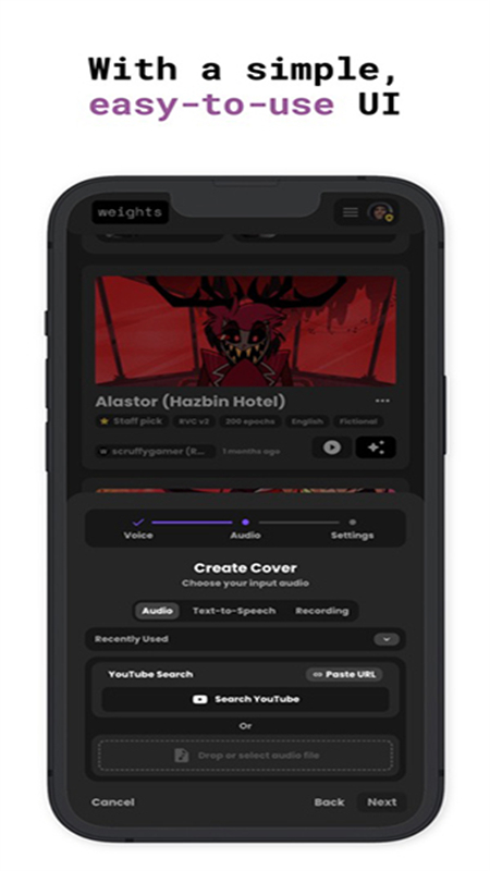 1、支持AI语音翻唱,导入音频就能生成不同风格的语音封面,轻松去创作。