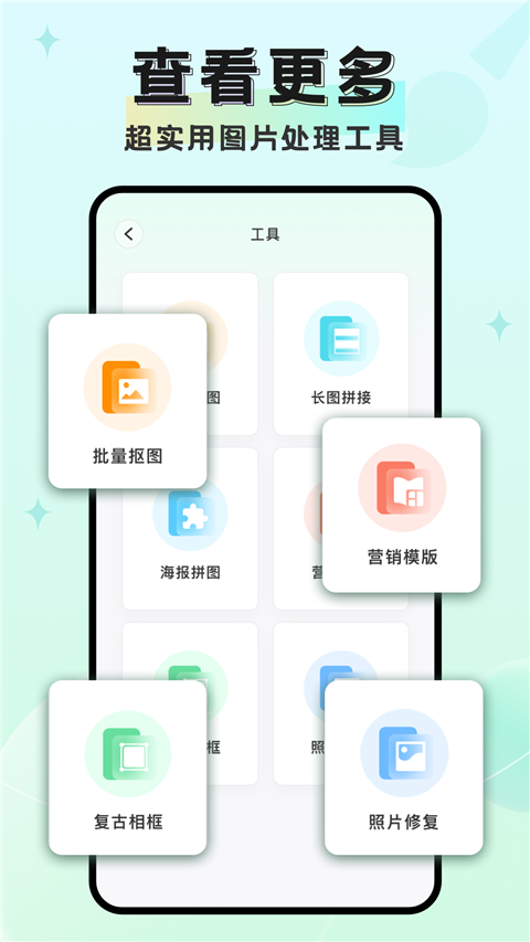 3、去码打码之外,抠图、去水印、拼图全包含,一个APP顶多个修图工具。