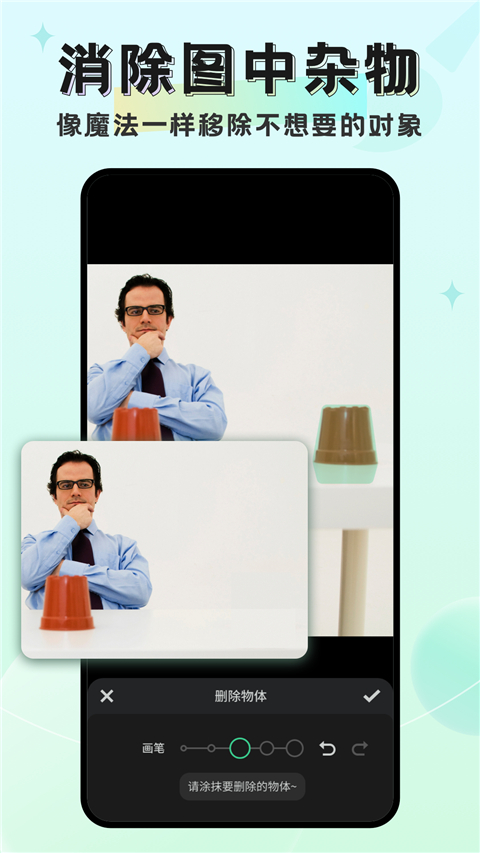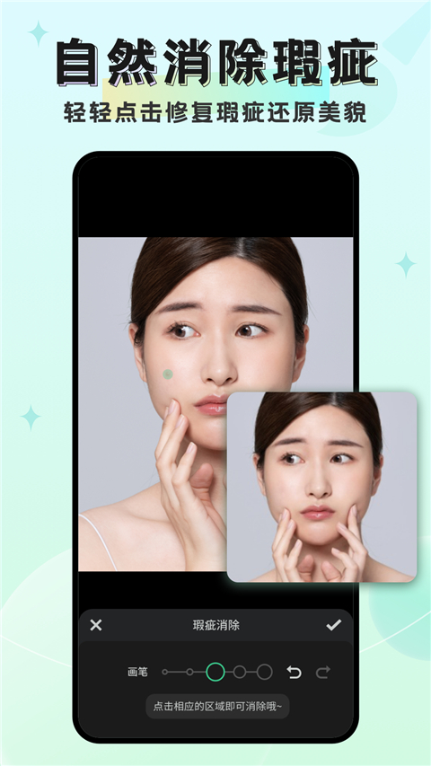 4、能消除图片瑕疵、移除多余物体,照片优化修复,能做人像美化,更精致。