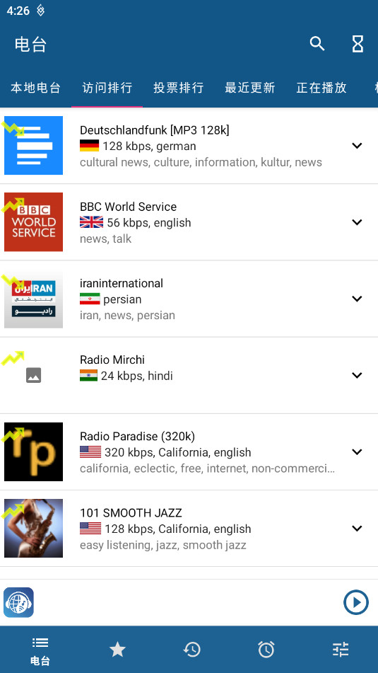 RadioDroid是一款可以任意去听广播电台的手机软件,打开就能直接听,体验超纯粹,汇集了全球各地的广播资源,不管是国内的CCTV-13新闻伴音,还是国外的BBC世界服务、德国文化电台,覆盖新闻、音乐、体育、娱乐等多个领域,想听啥类型都能找到,支持多平台使用,随时随地都能享受广播陪伴,还有收藏功能,遇到喜欢的电台一键标记,下次直接找到,再也不用反复搜索,任何时候想听广播都可以轻松实现,绝对能满足广播迷的所有收听需求。