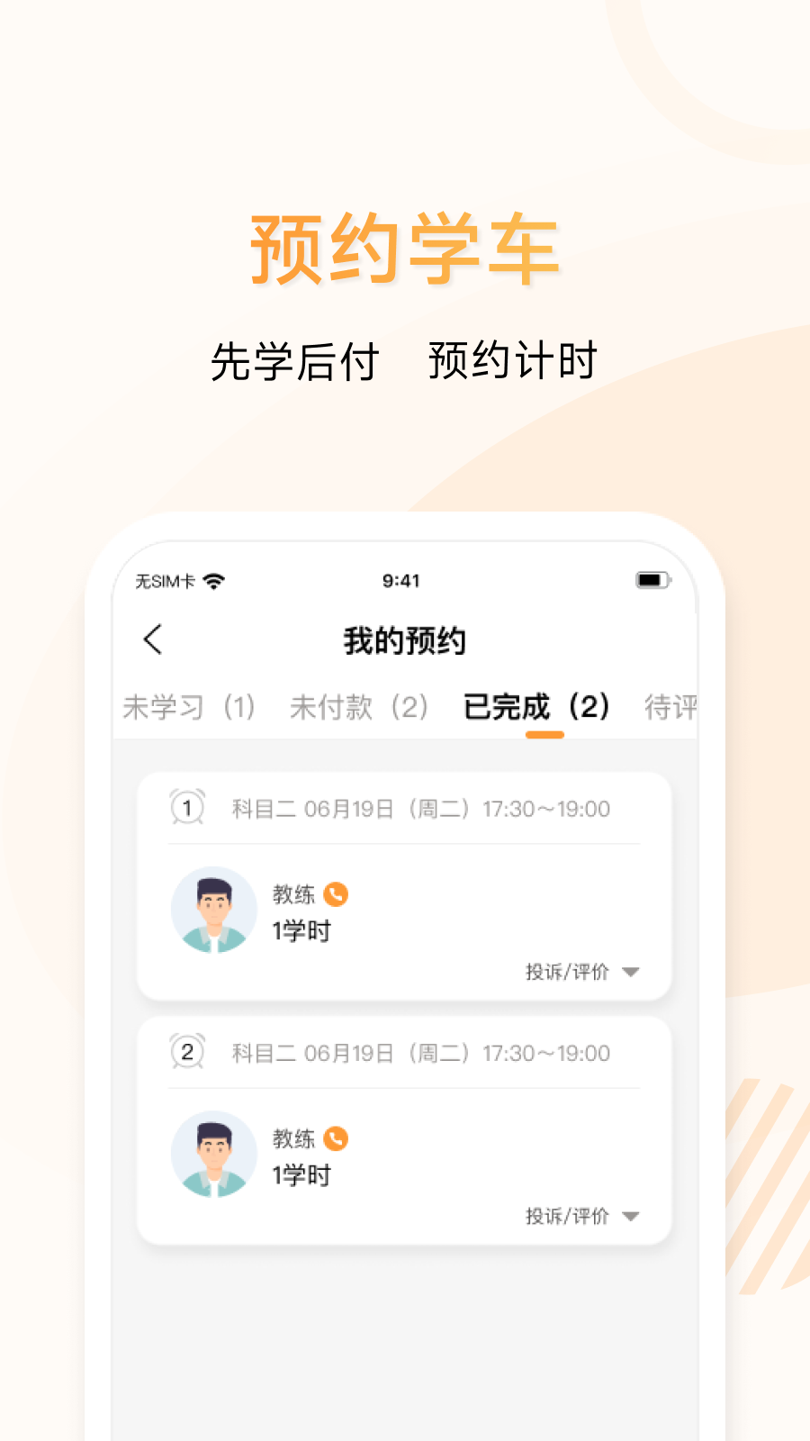 2、对教练服务进行评价或投诉,助力提升驾培服务质量,轻松去保障学员权益。