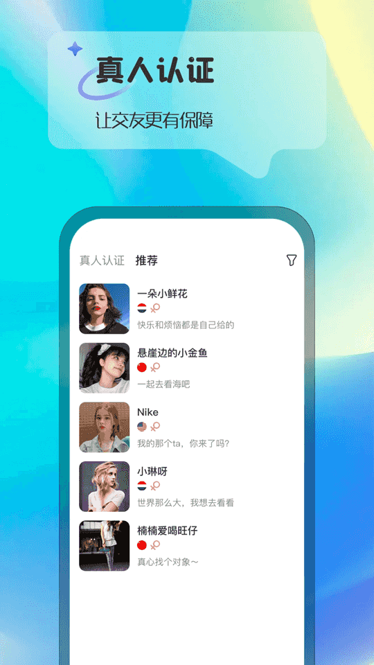 2、实行真人实名认证机制,用真实安全交友环境,户信息受严格保护,交友放心。