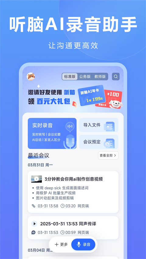 听脑AI是一款智能录音转文字手机软件,聚焦语音转写与智能总结需求,支持通话录音、手机内录、网络音频等多场景声音识别,转写准确率高,听脑AI覆盖超多行业上万条专业术语,通过AI智能模块自动提取关键信息,快速生成会议纪要与待办事项,还支持多语言翻译、网络音视频解析等拓展功能,搭配云端加密存储与多端同步,从实时转写到内容整理全流程提升效率,听脑AI适配会议记录、课堂学习、销售沟通等多元场景。