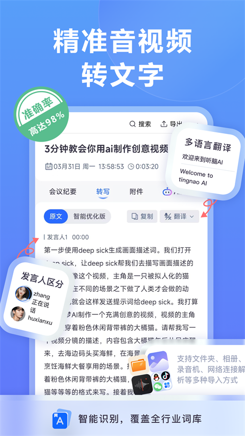听脑AI的转写准确率更高,让专业内容识别精准无误,实时转写、发言人区分等功能实用,AI智能总结能快速提炼核心信息,多端同步与云端加密保障了使用便捷性与安全性,多语言翻译和网络音视频解析拓展了应用场景,导入方式多样,适配办公、学习等不同需求,轻松去提升使用效率。