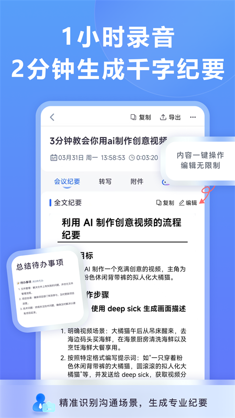 3、AI自动梳理录音中的核心要点、待办事项,轻松就可以提升工作学习效率。