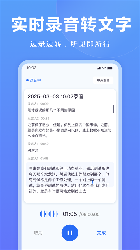 1、自动区分多位发言人,转写内容支持批量查找替换,编辑操作更灵活便捷。