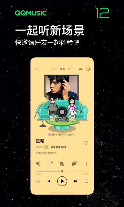 3、给好友点歌、分享音乐到社交平台,新增一起听功能,和好友远程同步去听歌。