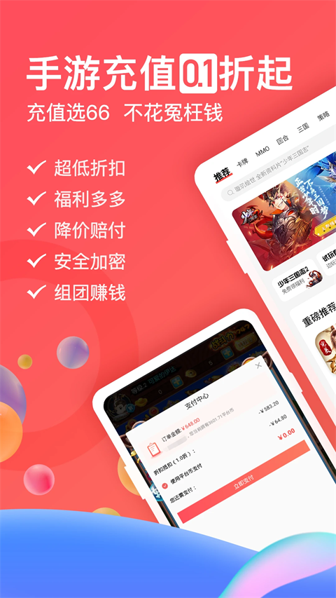 66手游是一款专为手游玩家提供省钱、省心的一站式服务的游戏软件,汇聚RPG、卡牌、仙侠、传奇、策略等万款热门手游,覆盖当下主流爆款作品,充值自动打折,低至一折起,安全有保障。66手游提供价格保护、折扣举报、账号交易、小号回收、游戏加速、独家礼包、代金券、平台币等多重福利,让玩家花更少钱获得更好游戏体验。内置游戏社区、攻略问答、开服表、资讯视频等内容,支持边玩边聊、大神带飞,66手游还能放心买卖账号、回收闲置小号,平台担保无中间商差价,福利天天领取。