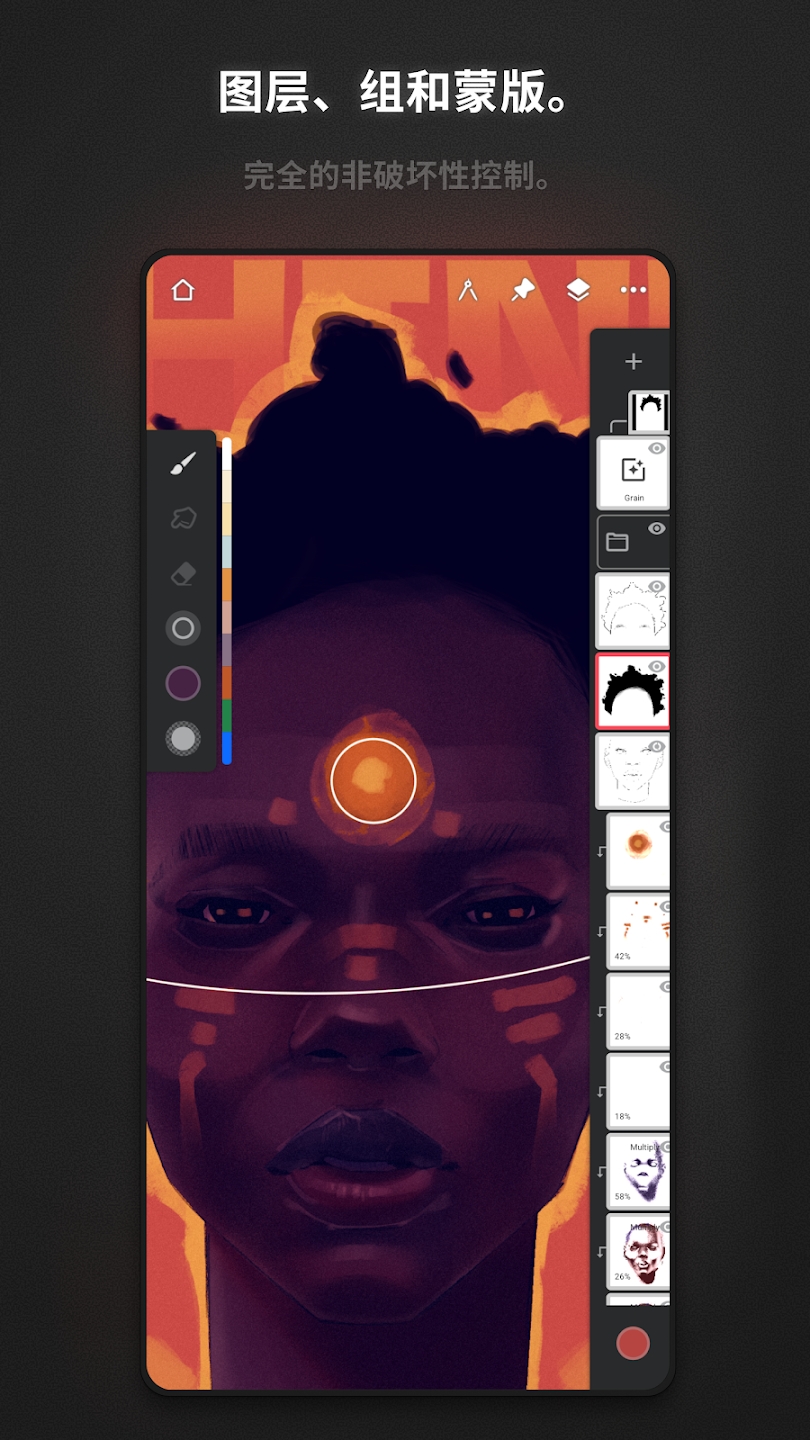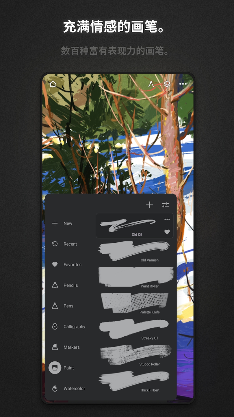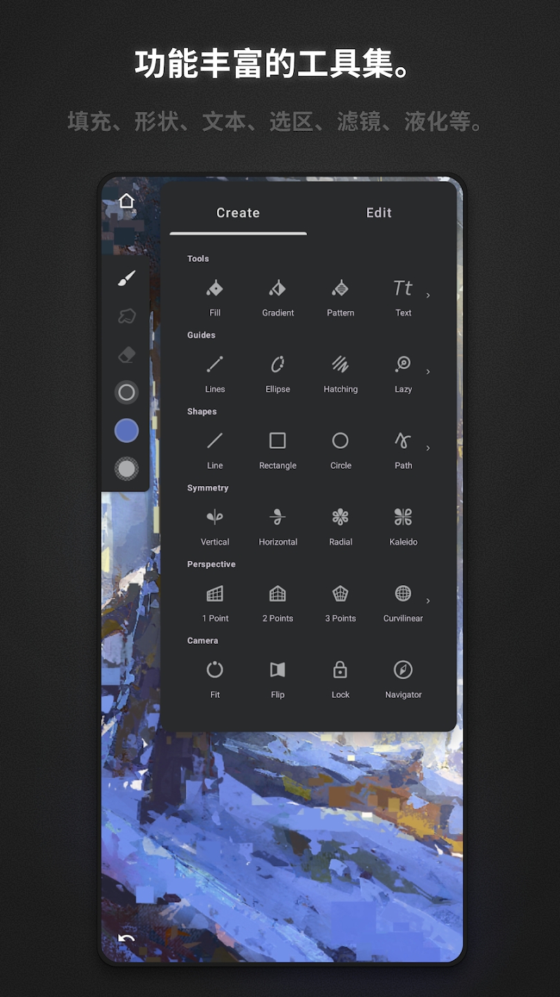 2、搭载液化渐变填充等工具,搭配纹理编辑功能,塑造逼真且独特的艺术画面效果。