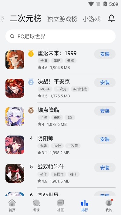 2、按游戏类型、热门榜单等多维度划分板块,还有二次元榜、独立游戏榜等特色榜单提供。